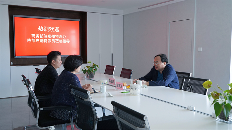 2022年9月29日上午,商務(wù)部駐鄭州特派員辦事處副特派員陳凱杰蒞臨鄭州天天會(huì)展服務(wù)有限公司(以下簡(jiǎn)稱:天天公司)調(diào)研指導(dǎo)工作,天天公司董事長(zhǎng)王友玲,副董事長(zhǎng)夏若天進(jìn)行了接待。